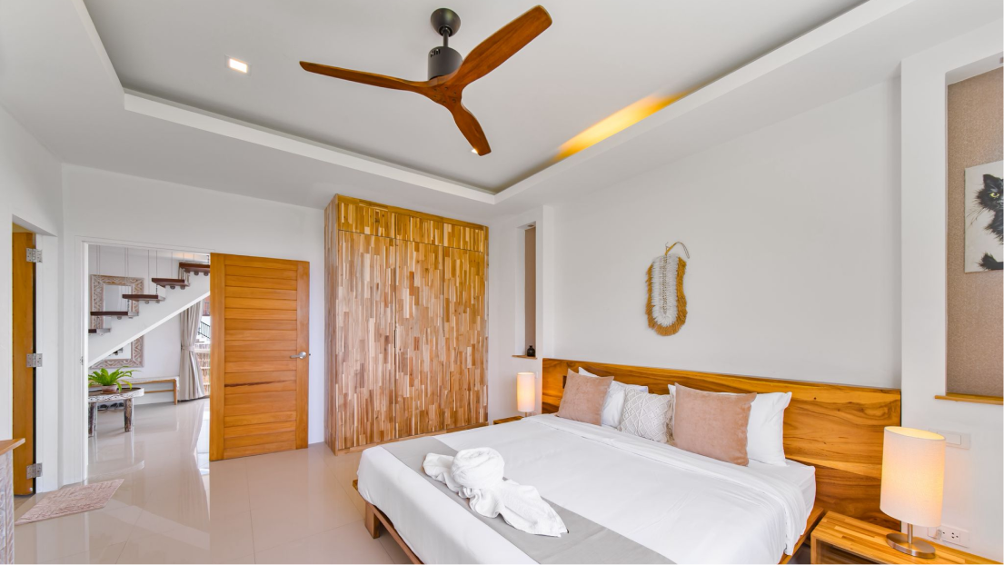This impressive three-storey villa offers uninterrupted 180° sea views over Koh Phangan and is designed for refined, comfortable living. The layout is ideal for a large family or dual living, with two bedrooms arranged as separate apartment-style units - perfect for guests or extended family.