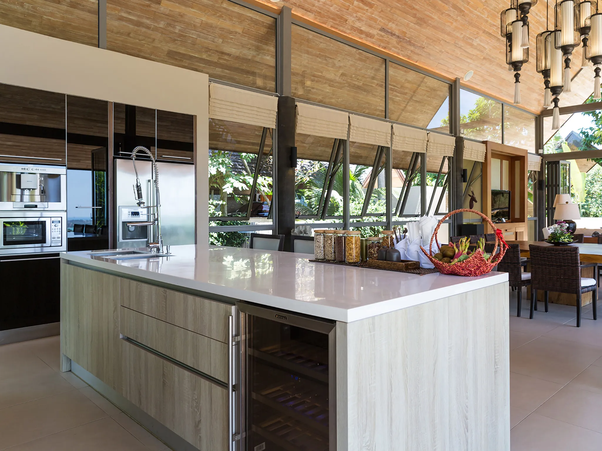 A square pedestal table for ten sits in the centre of the dining area, next to an open plan fully equipped kitchen with an island breakfast bar, top-of-the-range fitted appliances and a built-in wine cooler. On the far side of the dining table, the villa's spacious lounge area is furnished with three deeply cushioned upholstered sofas and two comfy chairs set around a rustic coffee table and oriented towards a Smart TV. The room is complemented by a modern chandelier and mood enhancing table lamps. Outside, a covered balcony runs along the entire length of the pavilion, protected by a clear glass barrier and overlooking the tropical garden and 20-metre infinity pool. All-weather chairs add a final touch, offering the perfect place to relax with a book, and enjoy the spectacular views while sipping an afternoon cocktail.