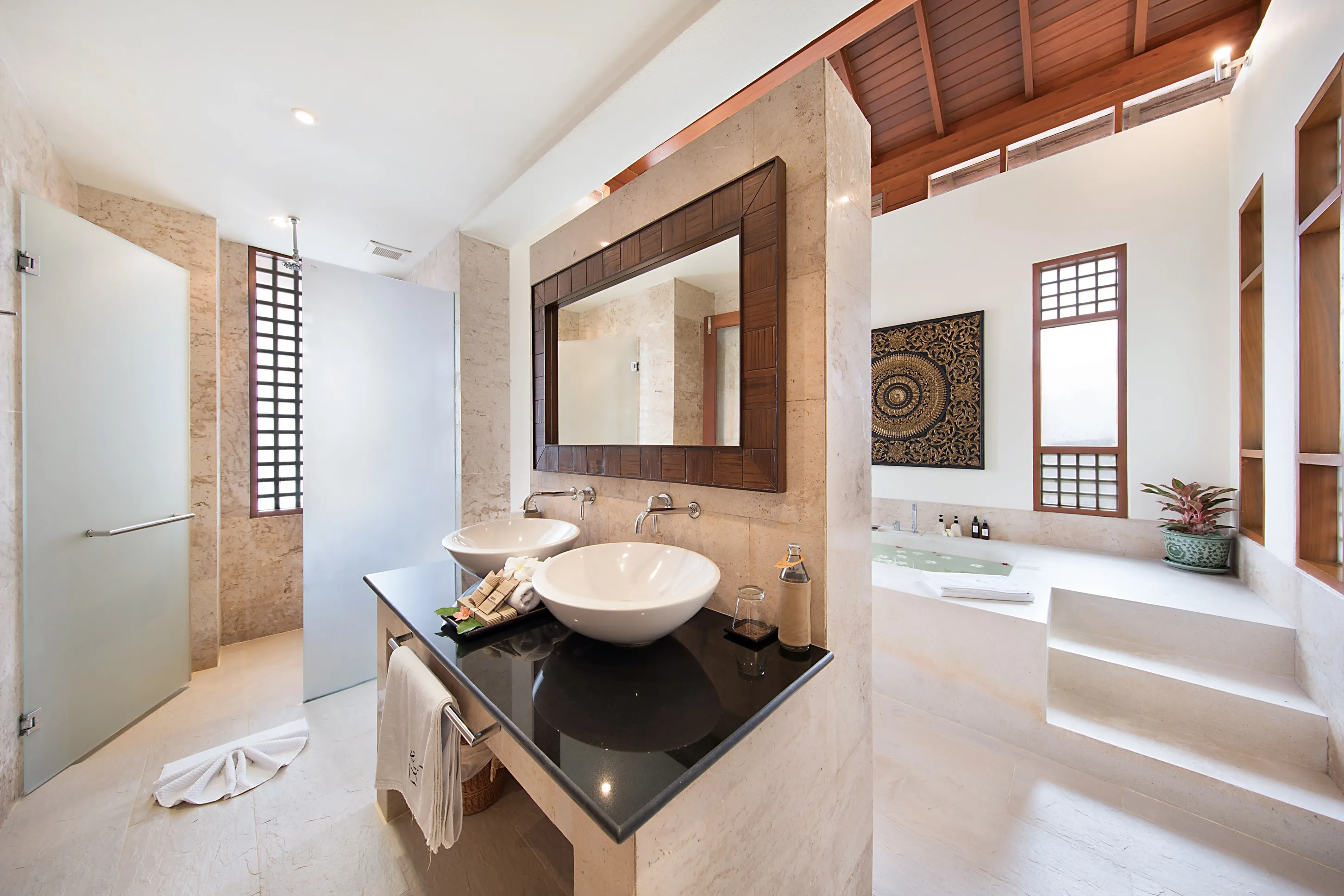 Stepping in, a little pathway with water features on either side takes you to the central courtyard. Its easygoing, tropical feel will set the tone for your holiday, complete with a wooden deck, gentle sea breeze, and decorative gardens. Grab a yoga mat from the villa and find a spot here for an open-air session. Enjoy a day with your loved ones in the 12-metre infinity pool, which has a built-in jacuzzi. Lounge on any of the 6 sunbeds with an engrossing read or enjoy an evening tipple as you watch the sunset over the horizon. If you’re in the mood for a livelier time, hook the playlist up to the outdoor speakers.