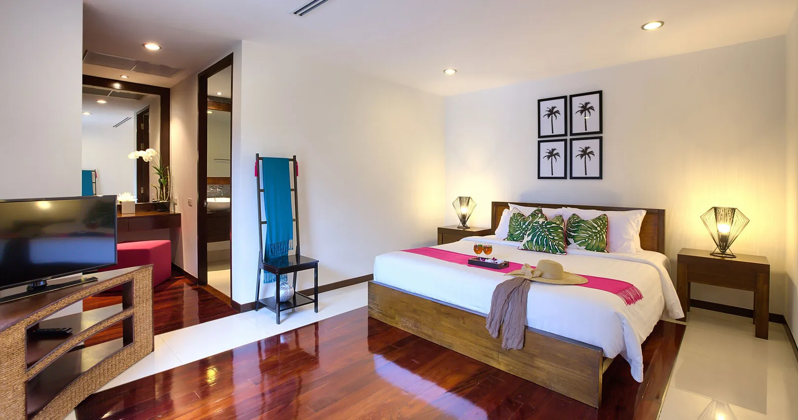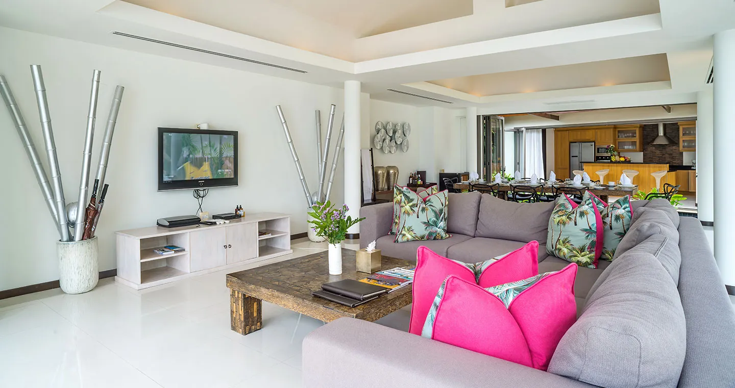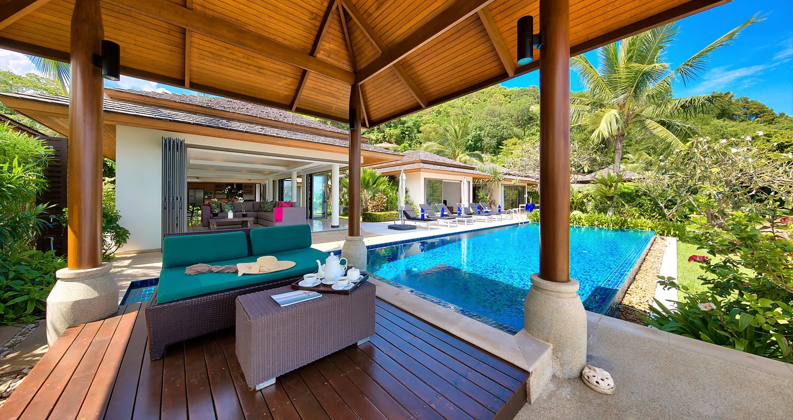 Sun seekers will love the 12m blue-tiled infinity pool, adjacent to a lawn and an outdoor terrace set with sun loungers and umbrellas. The poolside sala, a Thai-style gazebo, provides shade and the perfect spot for relaxation.