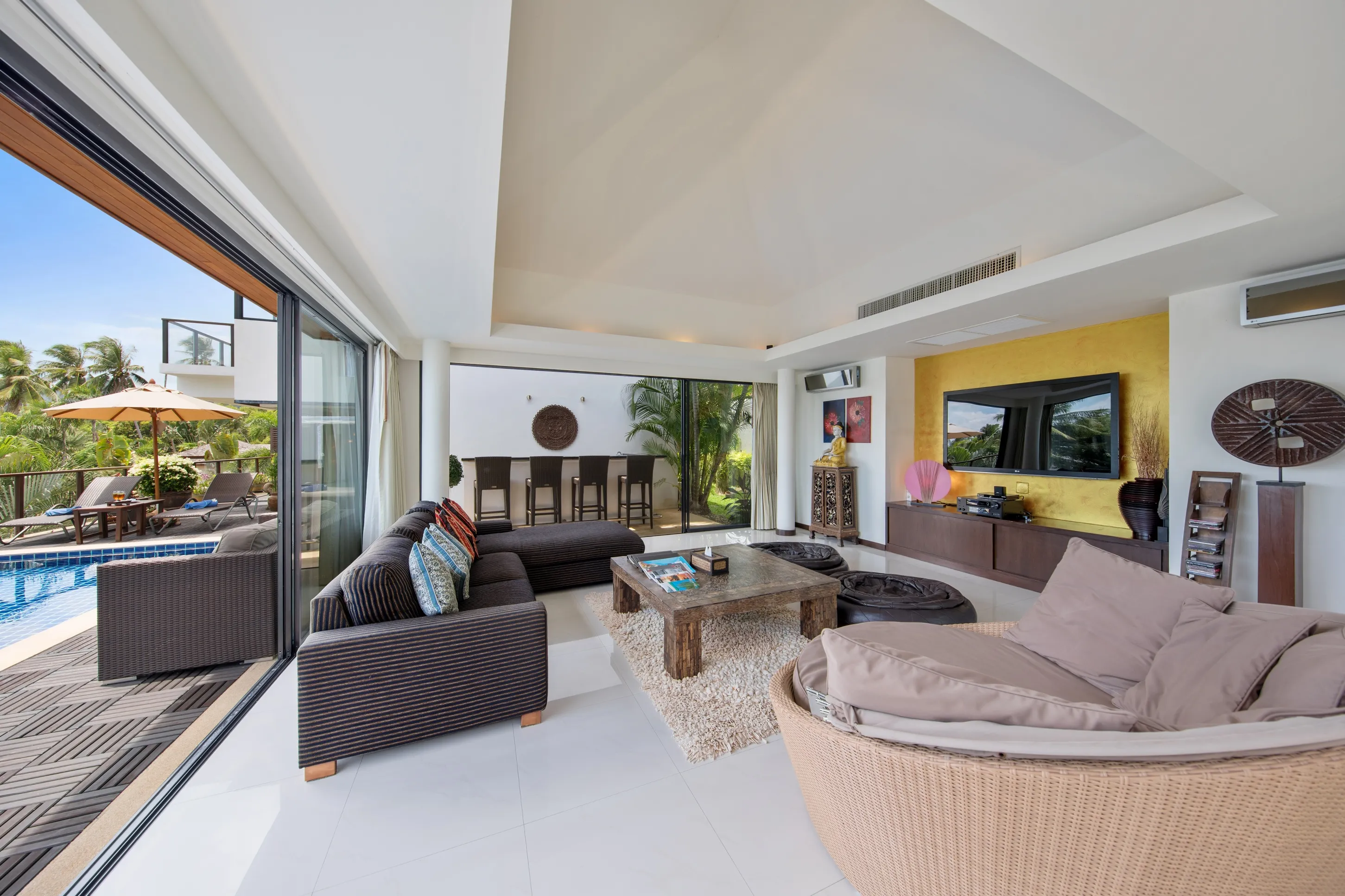Designed over three levels, this fully-staffed villa accommodates up to eight guests. The focal point is the large air-conditioned living and dining room, with floor-to-ceiling doors that slide open to a sea-facing 12m infinity pool. An outdoor terrace with daybeds and umbrellas invite you to relax and enjoy the sunshine, or while enjoying a refreshing dip in the pool.