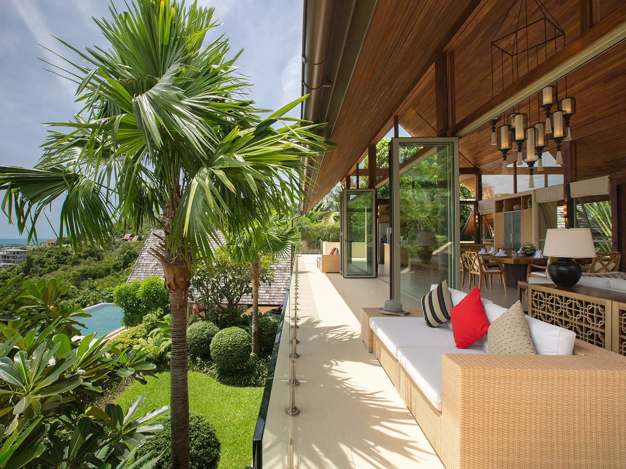 The elevated living and dining room extends almost the whole width of the property and has a very high, wood-lined vaulted ceiling with windows on both sides that increase the grandiose sense of space. A square pedestal table for ten sits in the centre of the dining area, next to an open plan fully equipped kitchen with an island breakfast bar and top-of-the-range fitted appliances, and a built-in wine cooler. On the other side, the villa's spacious lounge area is furnished with a creamy white sofa and two comfy chairs set around a cream marble coffee table and oriented towards a Smart TV. The room is complemented by a hanging candelabra and mood enhancing table lamps, while outside, a covered balcony runs along the entire length of the pavilion, protected by a clear glass barrier and overlooking the tropical garden and 20-metre infinity pool.