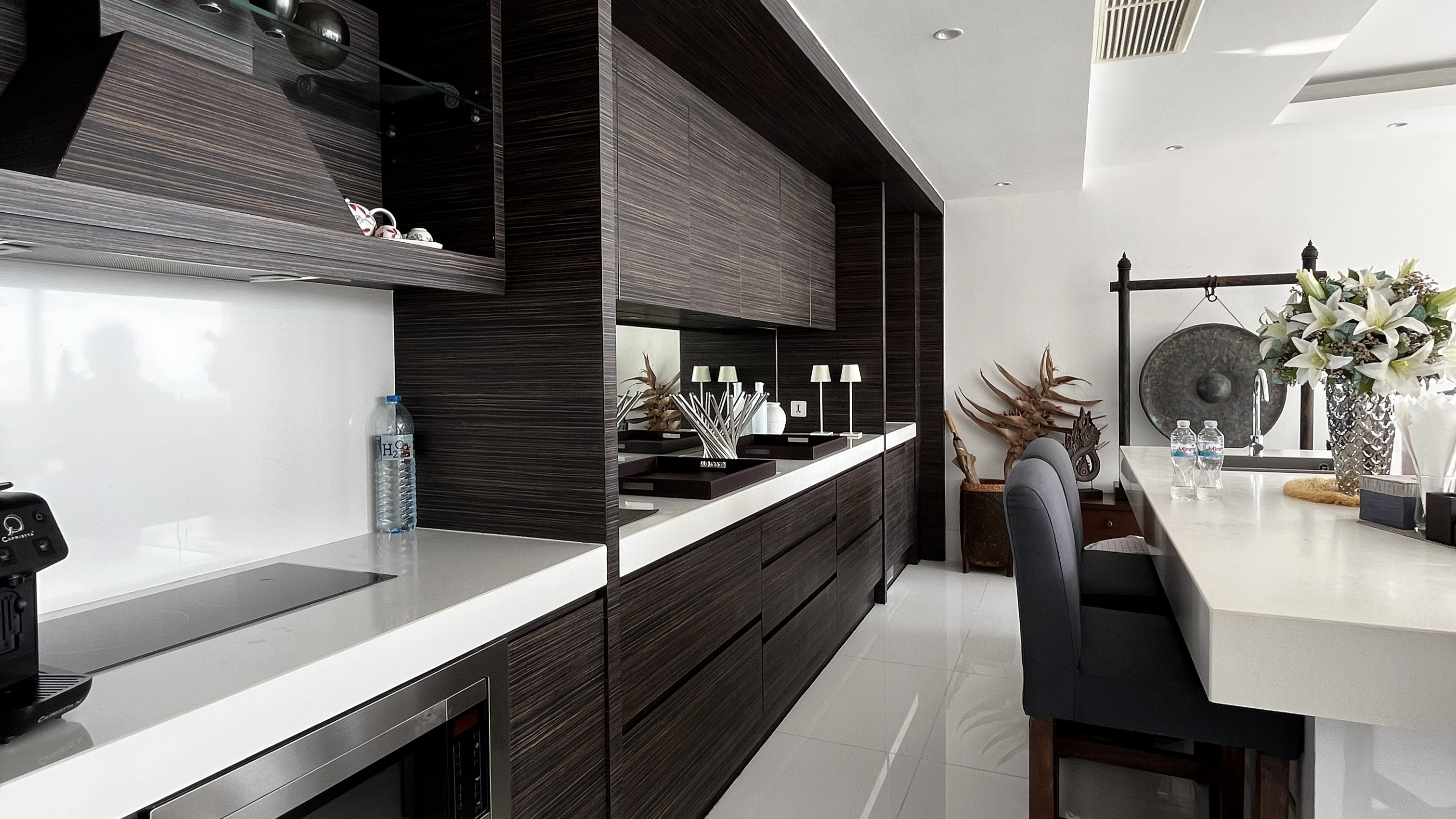 The villa offers uninterrupted 180° panoramic views over the Gulf of Thailand, Matlang Island, and the surrounding coastline.