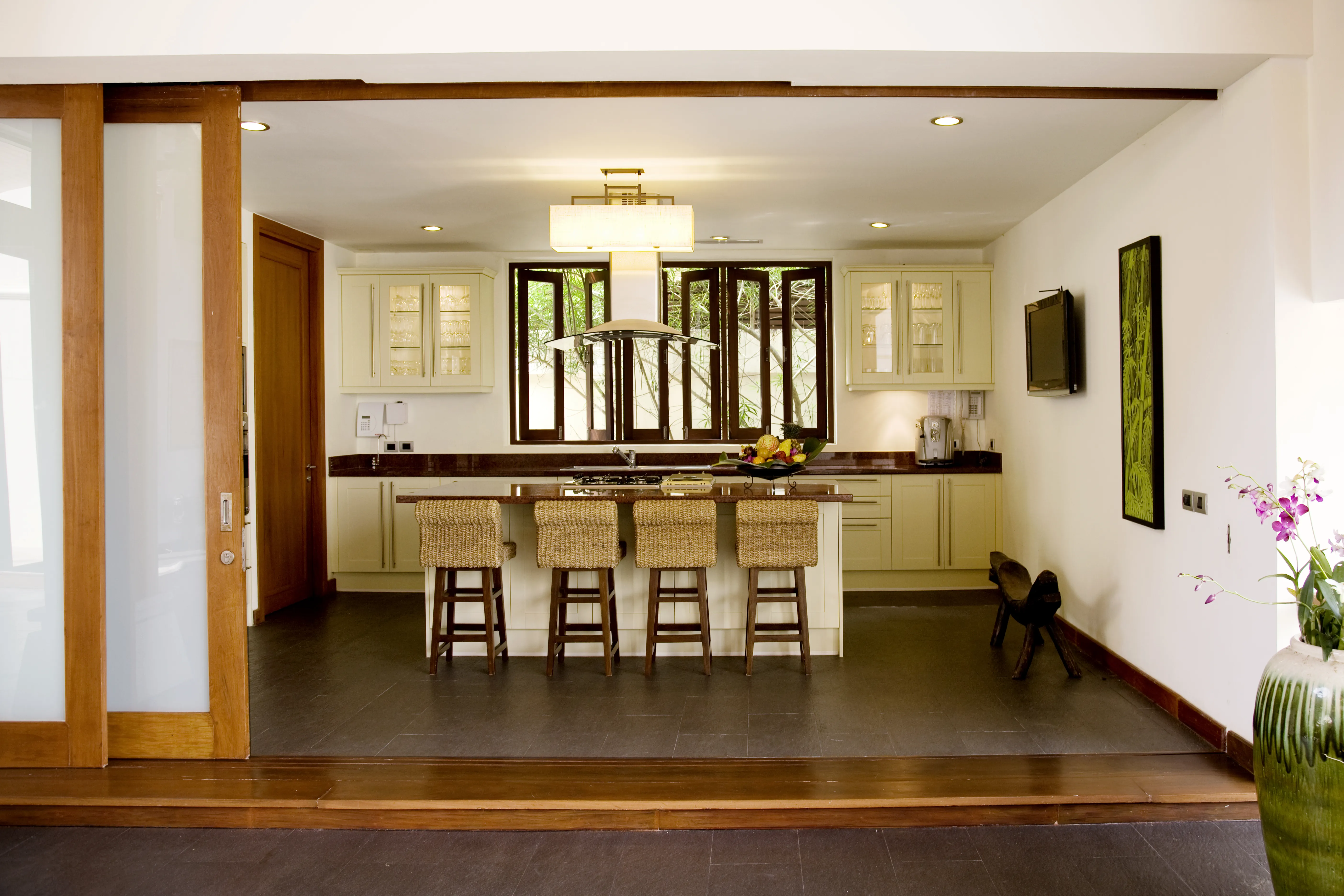 The kitchen is fully-furnished, with a glossy countertop. It includes a microwave, coffee machine, fridge, freezer, rice cooker, BBQ, stove top and an oven. Grab the bar stools and enjoy a round of cocktails with friends. Head to the outdoor beach sala and treat yourself to a dinner with panoramic views of sky and sea.