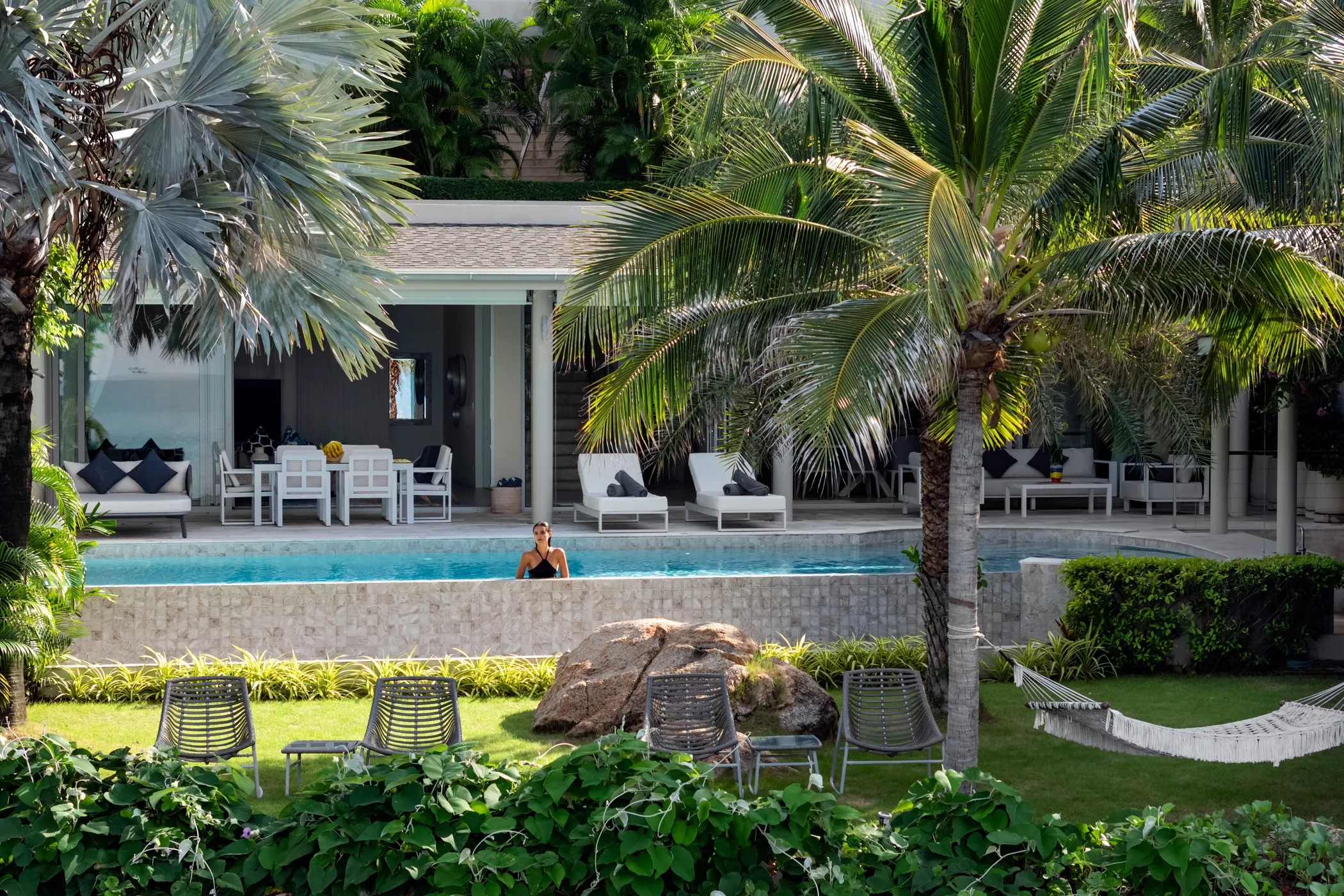 Interior design is carefully crafted by a British Designer and local artisanal works. High-quality textiles from Jim Thompson, natural material, and a neutral interior enhance the turquoise-coloured sea view.